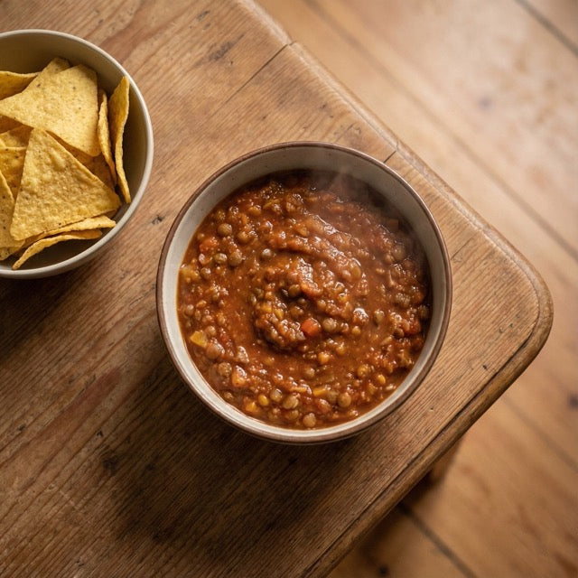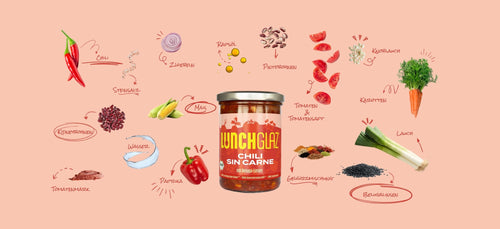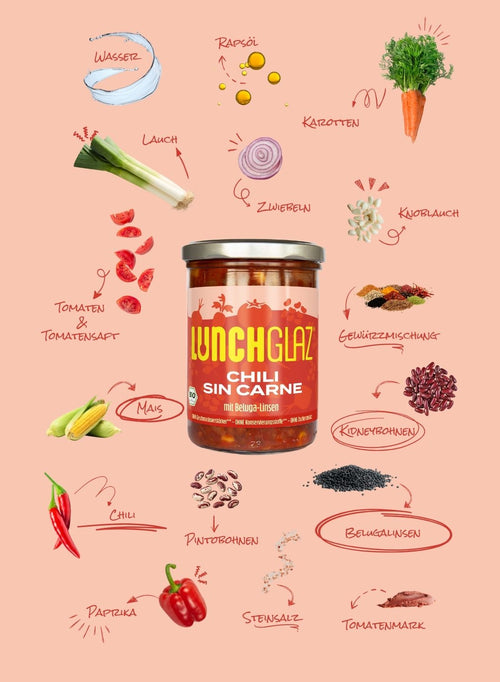 Gemüse* (Tomaten*, Paprika*, Mais*, Karotten*, Lauch*, Zwiebeln*, Knoblauch*), Wasser, Tomatensaft*, Pintobohnen*, Kidneybohnen*, 5,1% Belugalinsen*, Rapsöl*, Tomatenmark*, Steinsalz, Gewürzmischung*, 0,03% Chili*.