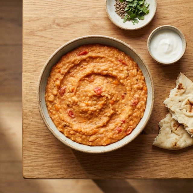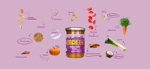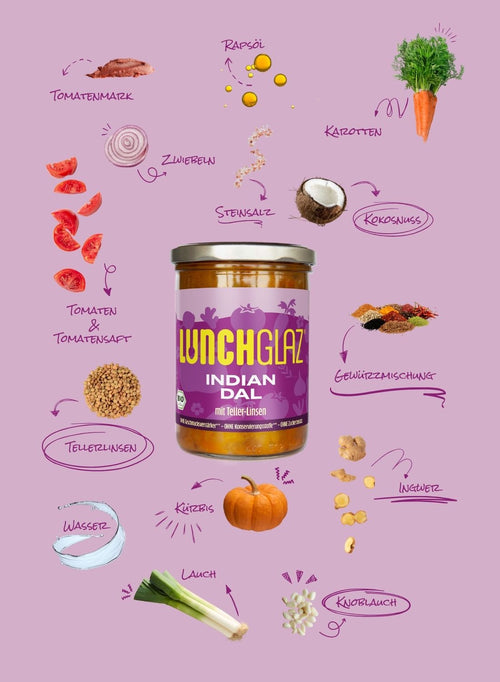 Gemüse* (Kürbis*, Lauch*, Karotten*, Tomaten*, Zwiebeln*, Ingwer*, Knoblauch*), Wasser, 9,8% Tellerlinsen*, Kokosnuss*, Tomatensaft*, Tomatenmark*, Rapsöl*, Gewürzmischung*, Steinsalz.