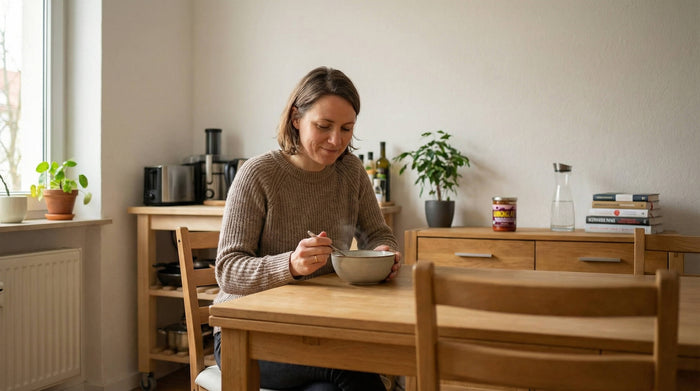 Inhalt im Topf erhitzen oder in einer Schale in der Mikrowelle (3 Minuten bei 600 W). Bei Bedarf 2 EL Wasser zugeben.