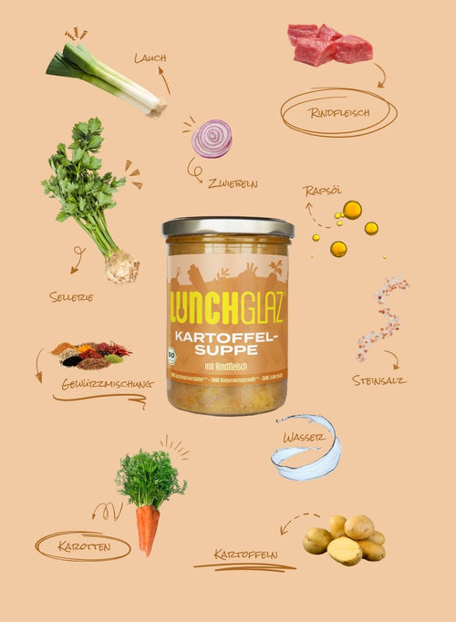 Gemüse* (25,6% Kartoffeln*, Karotten*, Zwiebeln*, Lauch*, Sellerie*), Wasser, 12% Rindfleisch*, Rapsöl*, Gewürzmischung*, Steinsalz.