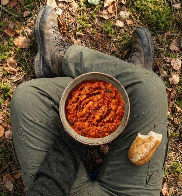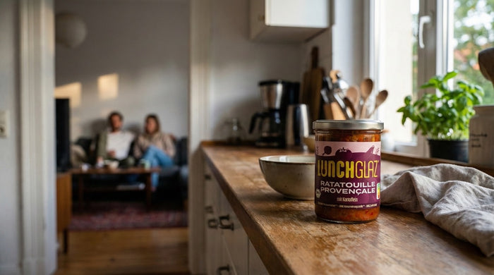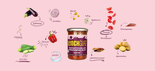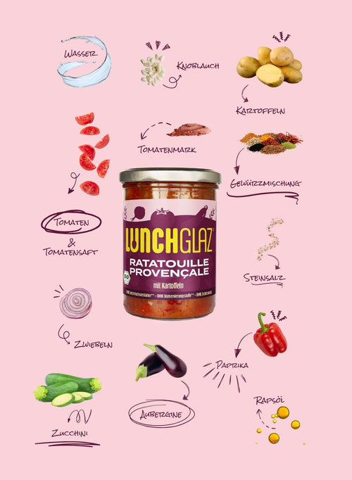 Gemüse* (Tomaten*, 17,2% Kartoffeln*, Paprika*, Zucchini*, Aubergine*, Zwiebeln*, Knoblauch*), Tomatensaft*, Wasser, Rapsöl*, Tomatenmark*, Steinsalz, Gewürzmischung*.